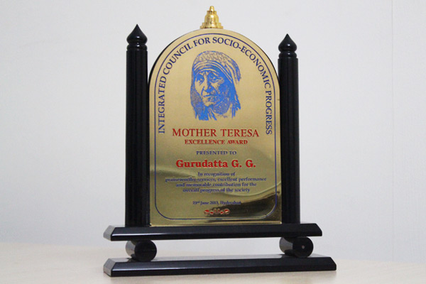 MOTHER THERESA EXCELLENCE AWARD for 2013 by Integrated Council of Socio Economic Progress, Thrissur, on 22nd June 2013.